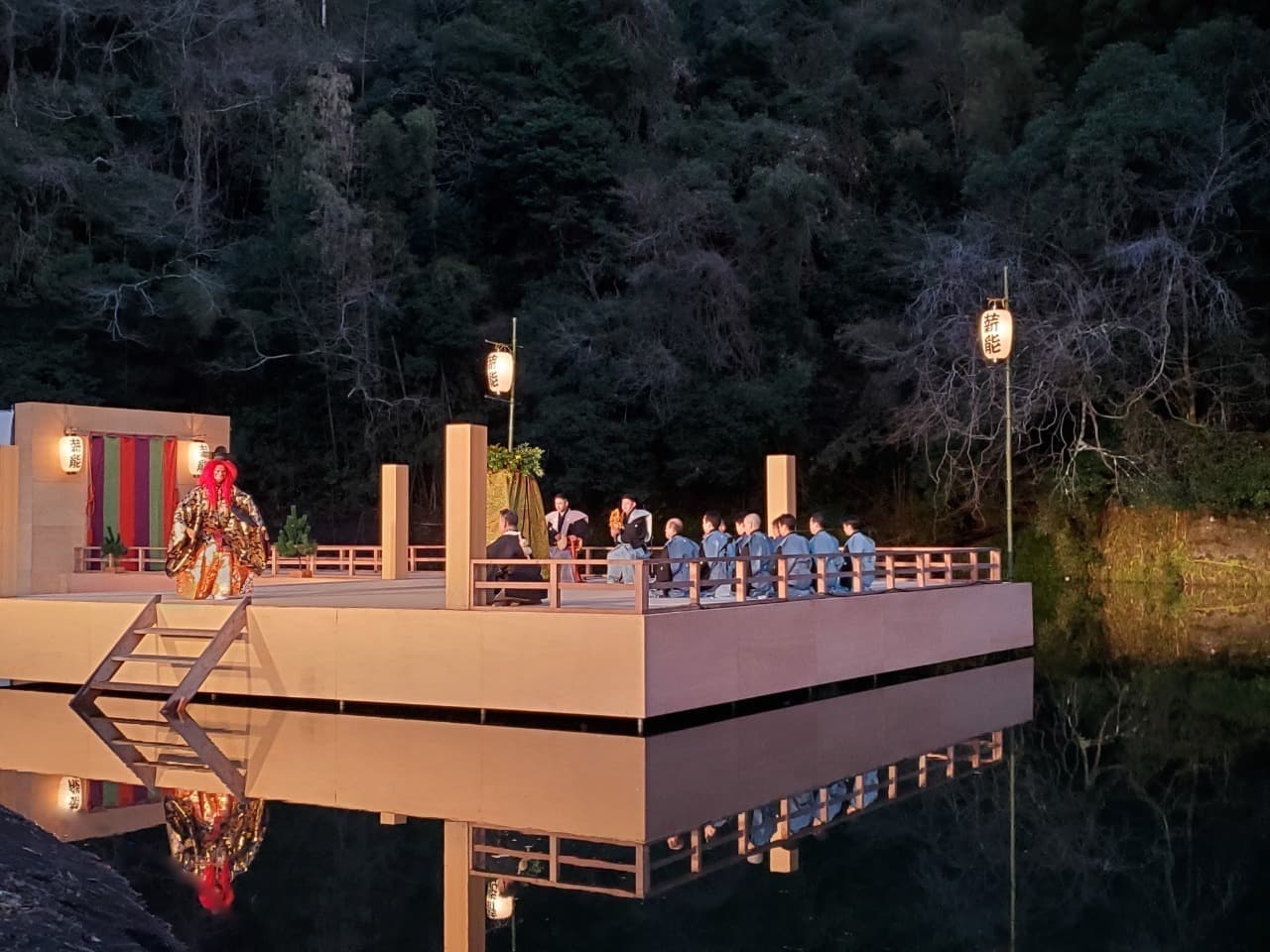 “水上能舞台”と水面に映る三日月が描き出す幻想