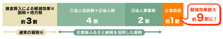 ※企業が地方公共団体に寄附した場合は、その全額が損金算入されるため、寄附額の約3割(法人実効税率)相当額の税の軽減効果があります。